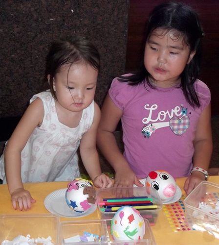 Alexa and Joseph enjoying the Egg Decoration at Conrad